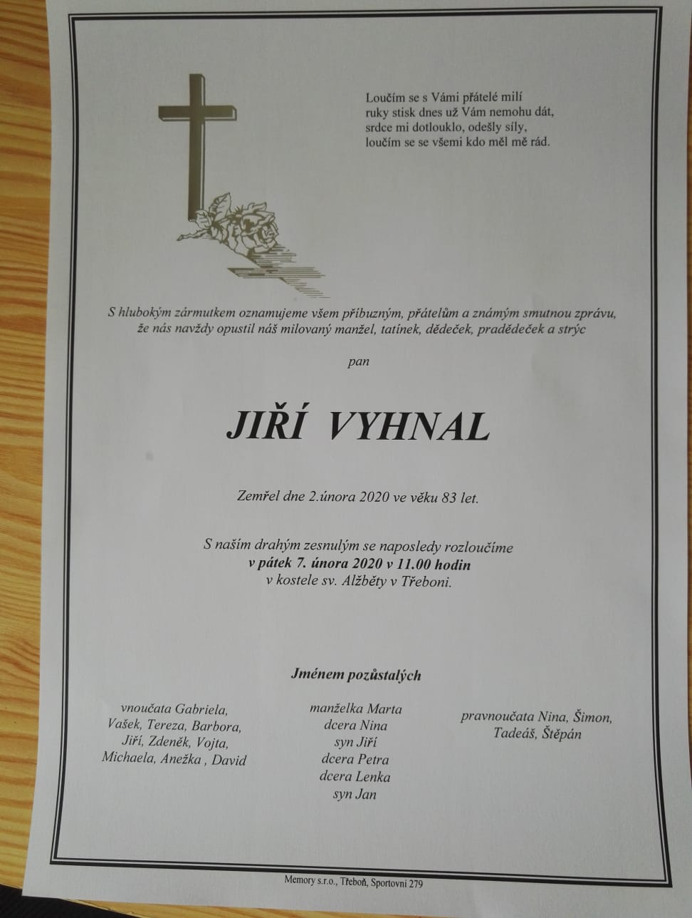 Poslední rozloučeni s panem Jiřím Vyhnalem se bude konat v kostele sv. Alžběty (třeboňský hřbitov) v Třeboni v pátek 7.2.2020 od 11:00 hod.