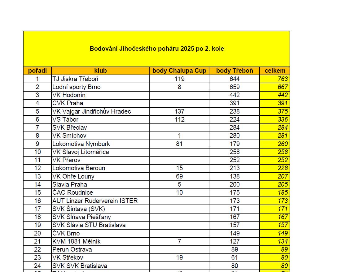 Po Třeboňské regatě se oddíl TJ Jiskry Třeboň ujal vedení v Jihočeském poháru a celkové vítězství bude hájit v sobotu 20.9.2025 na posledním kole Jihočeského poháru v Táboře.