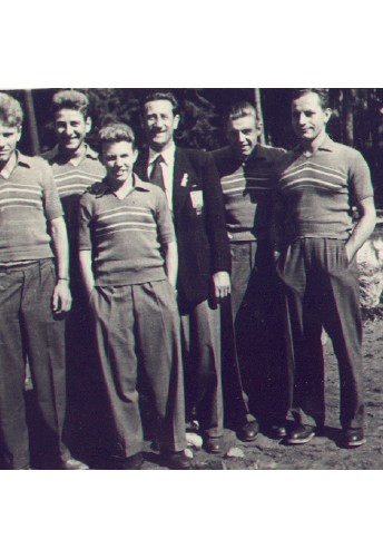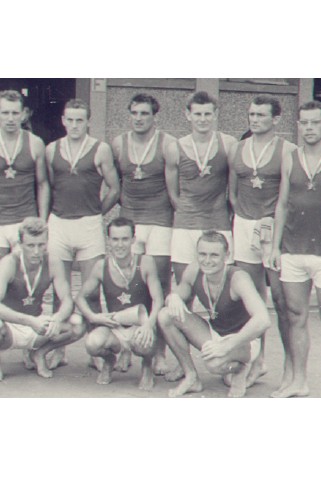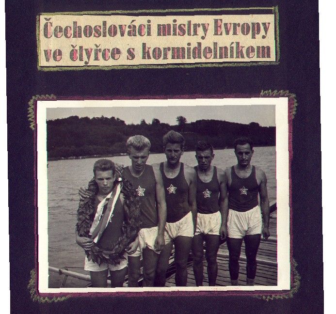 Čtyřka s kormidelníkem olympijských vítězů z Helsinek 1952 - M.Mejta, J. Havlis, J. Jindra, S. Lusk, korm. Koranda