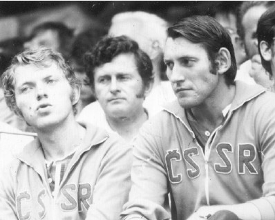 Nová generace odstartovala další úspěšnou éru třeboňských reprezentantů v roce 1969 na MSJ v Neapoli : (zleva) J. Louvar, trenér V. Kunc, A. Kotil.